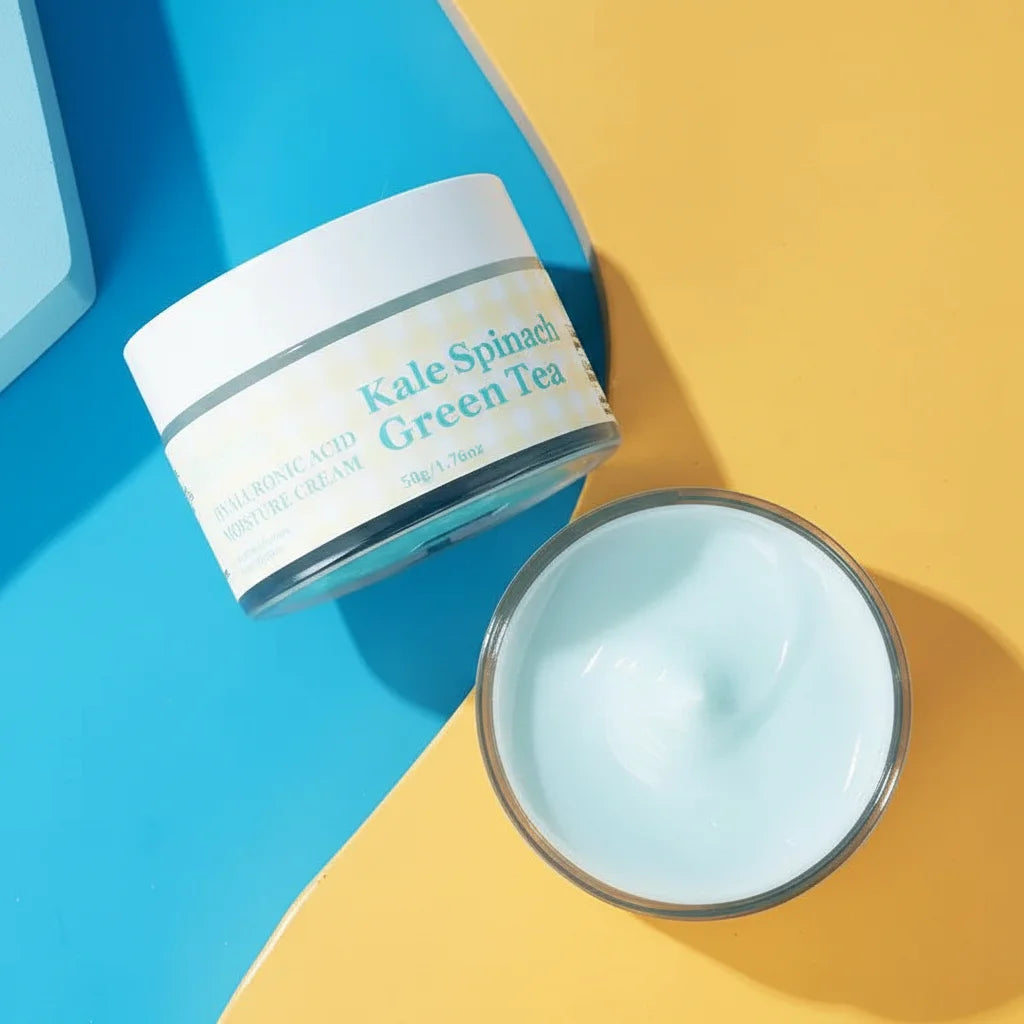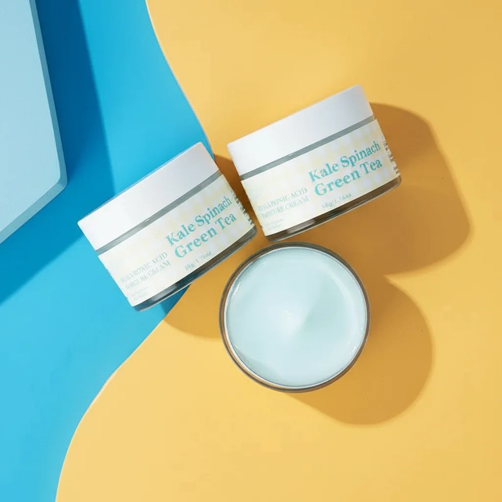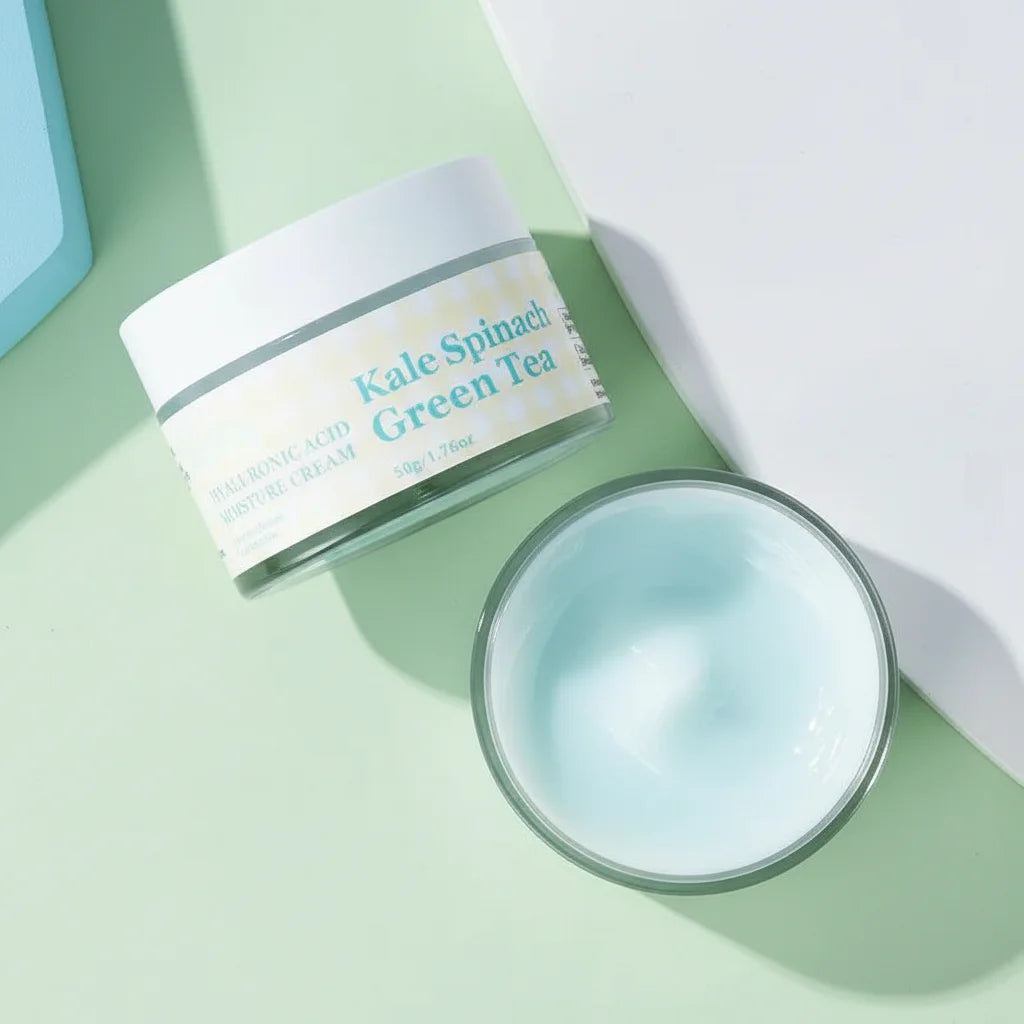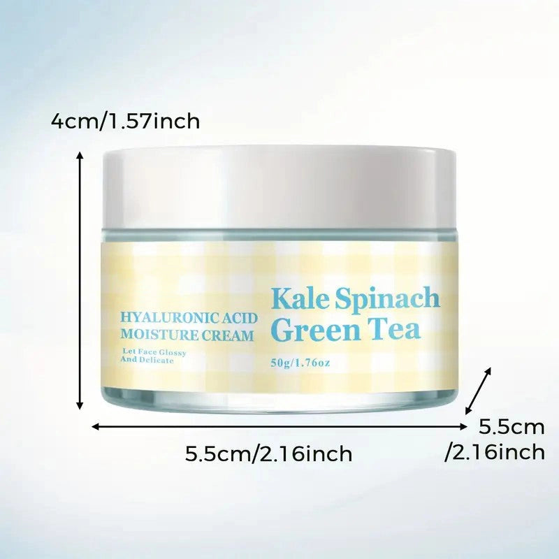 Our unique blend of hyaluronic acid with Kale, Spinach, and Green Tea is a true botanical essence! It doesn't just hydrate; it actively revives your skin, leaving it dewy, supple, and absolutely vibrant from within.