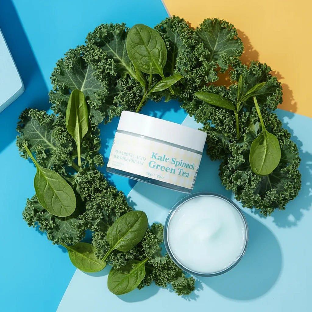 It's the exquisite blend of hyaluronic acid, Kale, Spinach, and Green Tea! This potent botanical essence deeply hydrates, revives your natural glow, and leaves your skin feeling supple and truly vibrant. It's nature's secret to unlock your best radiance.
